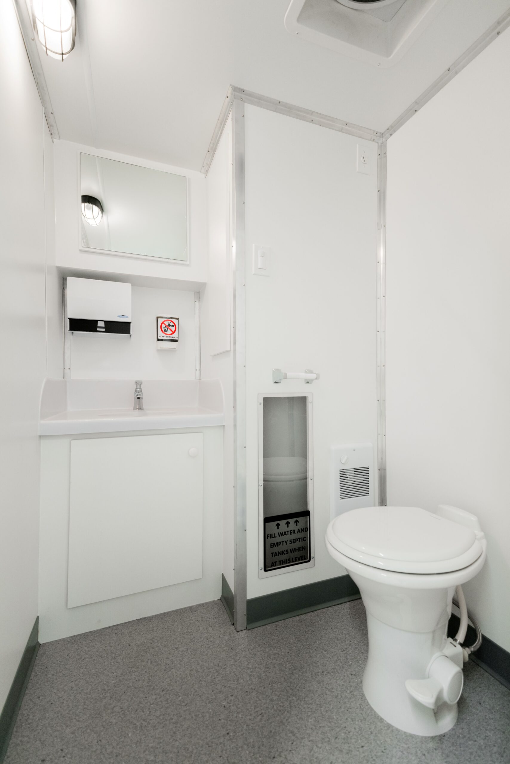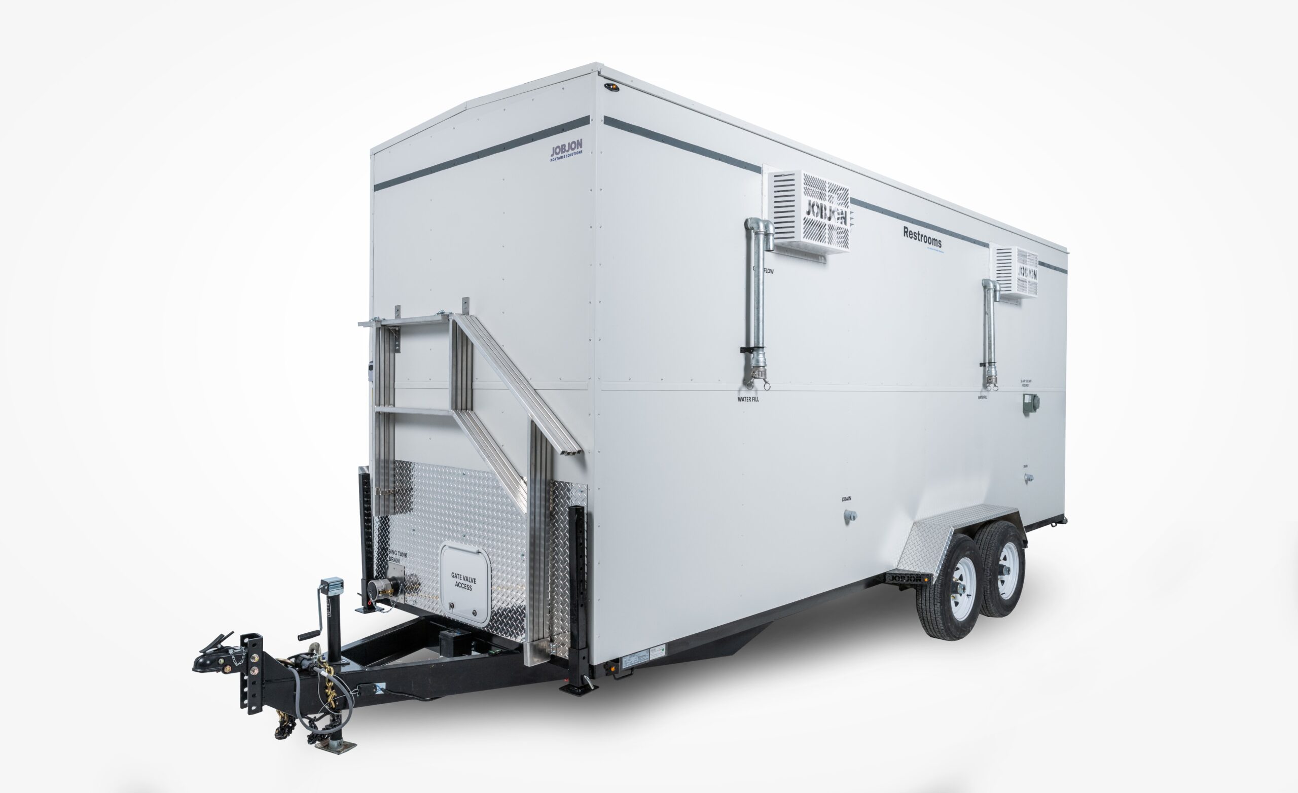 Introducing the JobJon 200-W- an exquisite luxury portable washroom with two spacious stalls. Step into a world of unparalleled elegance and comfort, where every detail has been meticulously designed. These models complement your worksite, site office, or lunchroom. Options include the skid unit, trailer unit, and shower combo unit.
