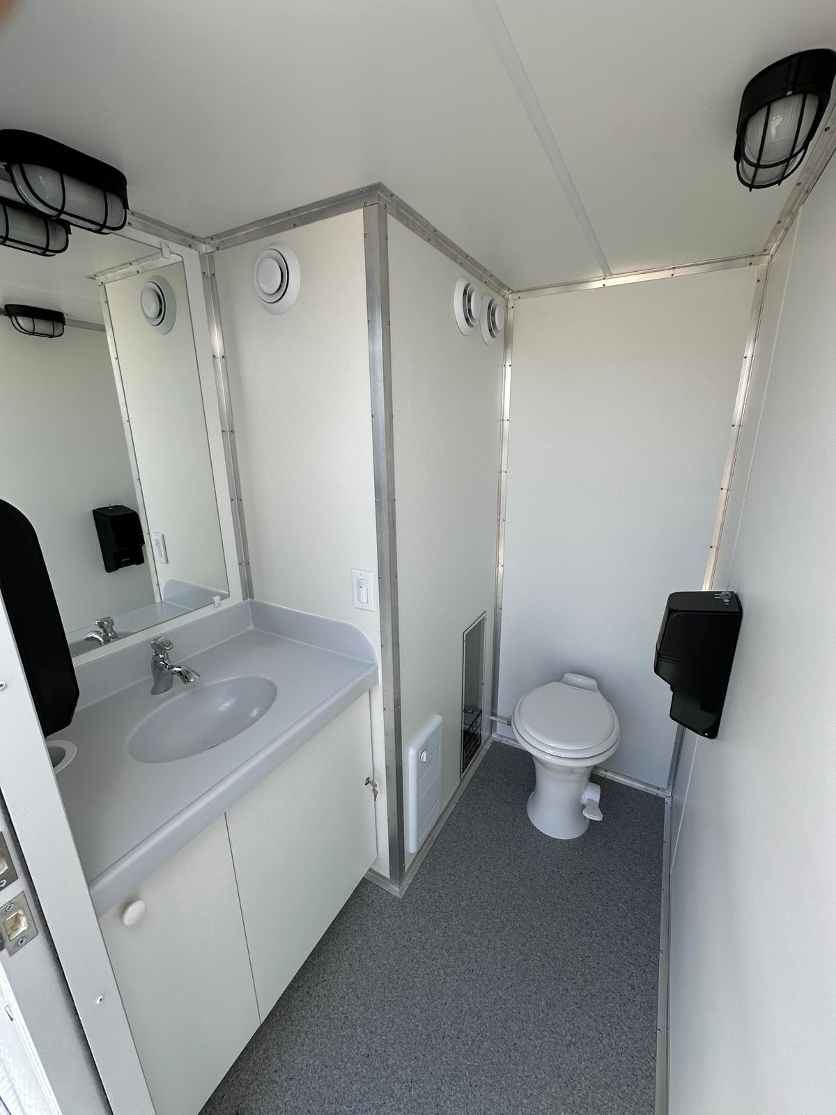 - Single stall, skid-mount washroom