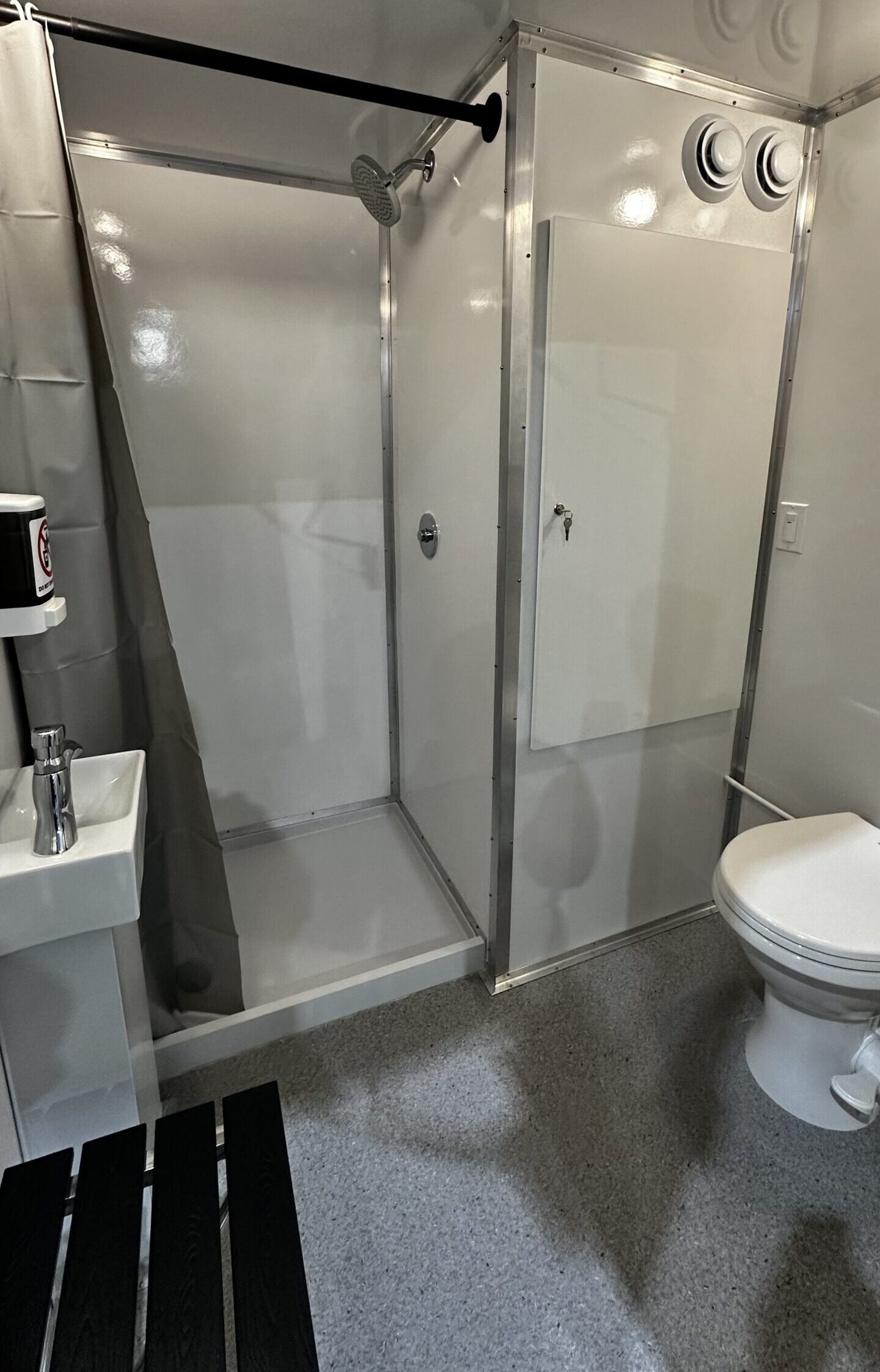 The JobJon 200-S shower unit is sleek, efficient, and easily incorporated into your job site. The exterior is all white, with interior that is white with aluminum trim, plus commercial grade vinyl flooring.